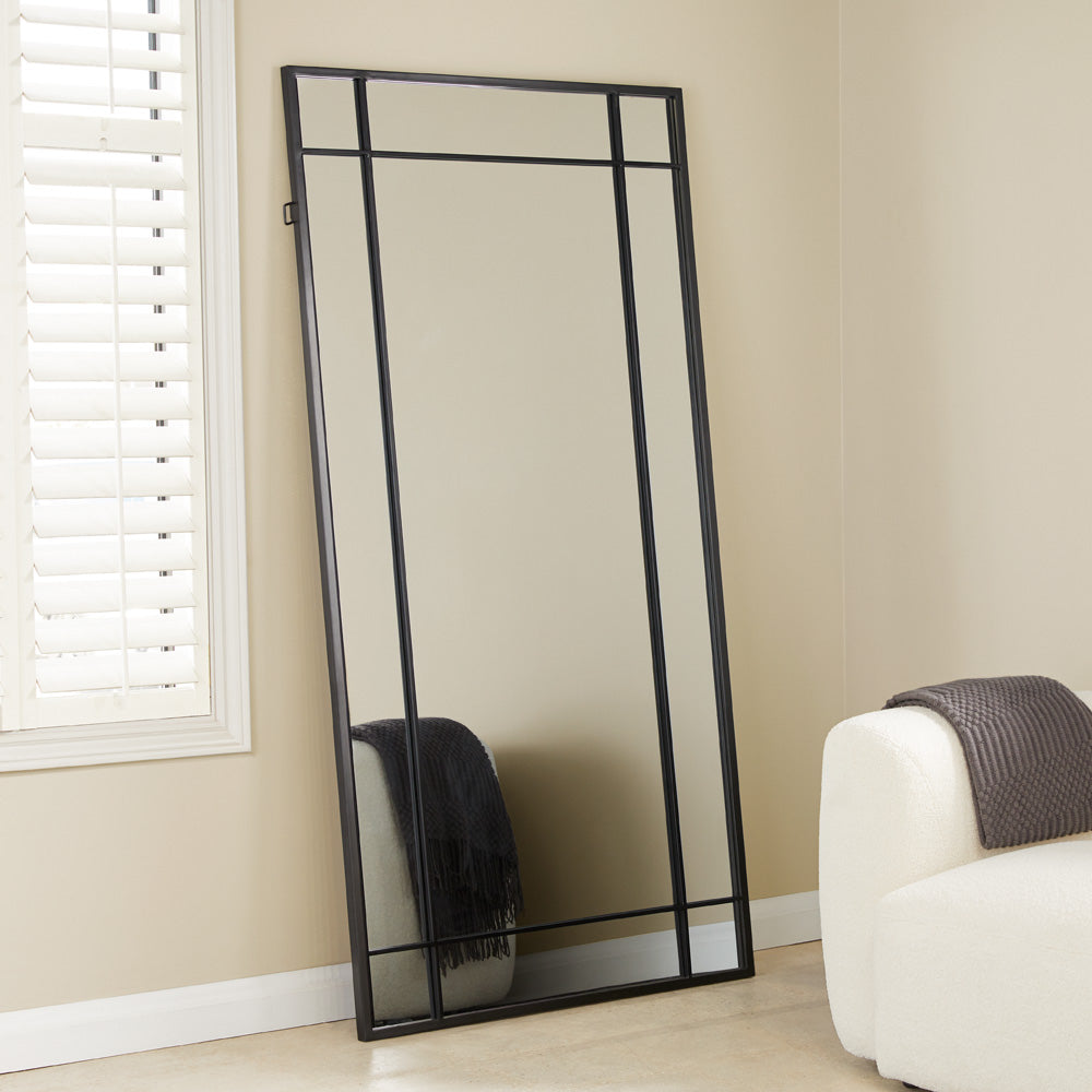 Introducing the Blake floor mirror, a striking statement piece designed to elevate any space with its captivating presence. Encased in a sleek black frame, this floor mirror commands attention with its bold design and contemporary allure. The expansive reflective surface not only adds depth and dimension to your room but also serves as a functional accent piece, perfect for checking your reflection before stepping out. Whether placed in a living area, bedroom, or hallway, the Blake floor mirror exudes sophistication and style, making it a must-have addition to any modern interior setting.