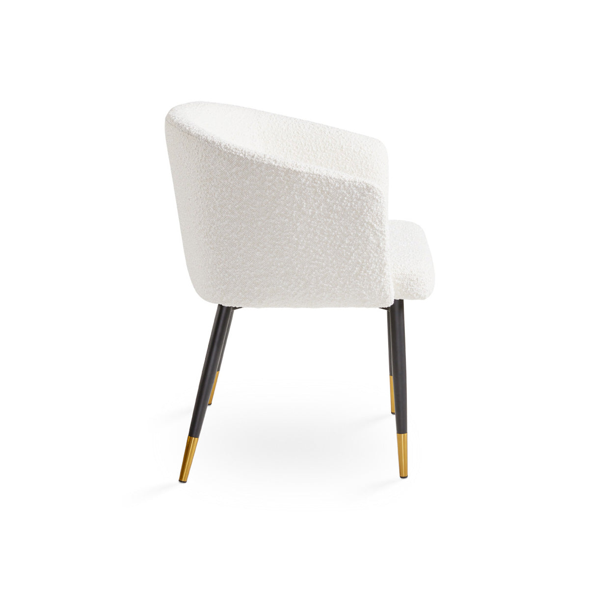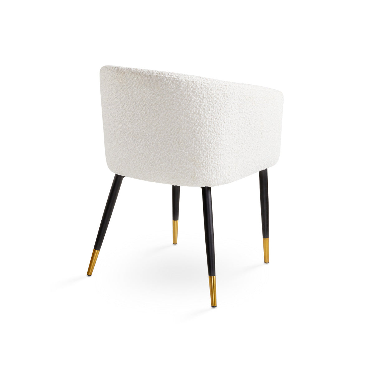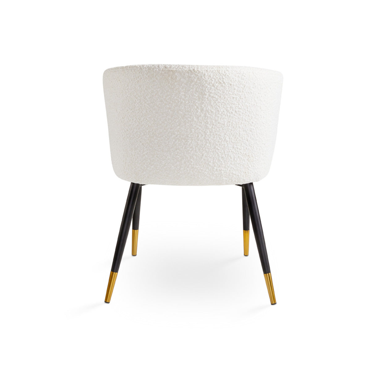 A diners delight. The perfectly molded Felix dining chair in white conforms to your needs on every level. Whether for long dinners filled with laughter or quick meetings at the dining table, its barrel-back design provides the utmost comfort and stability. Fitted with stunning brushed gold caps to dress-up the classical design.
